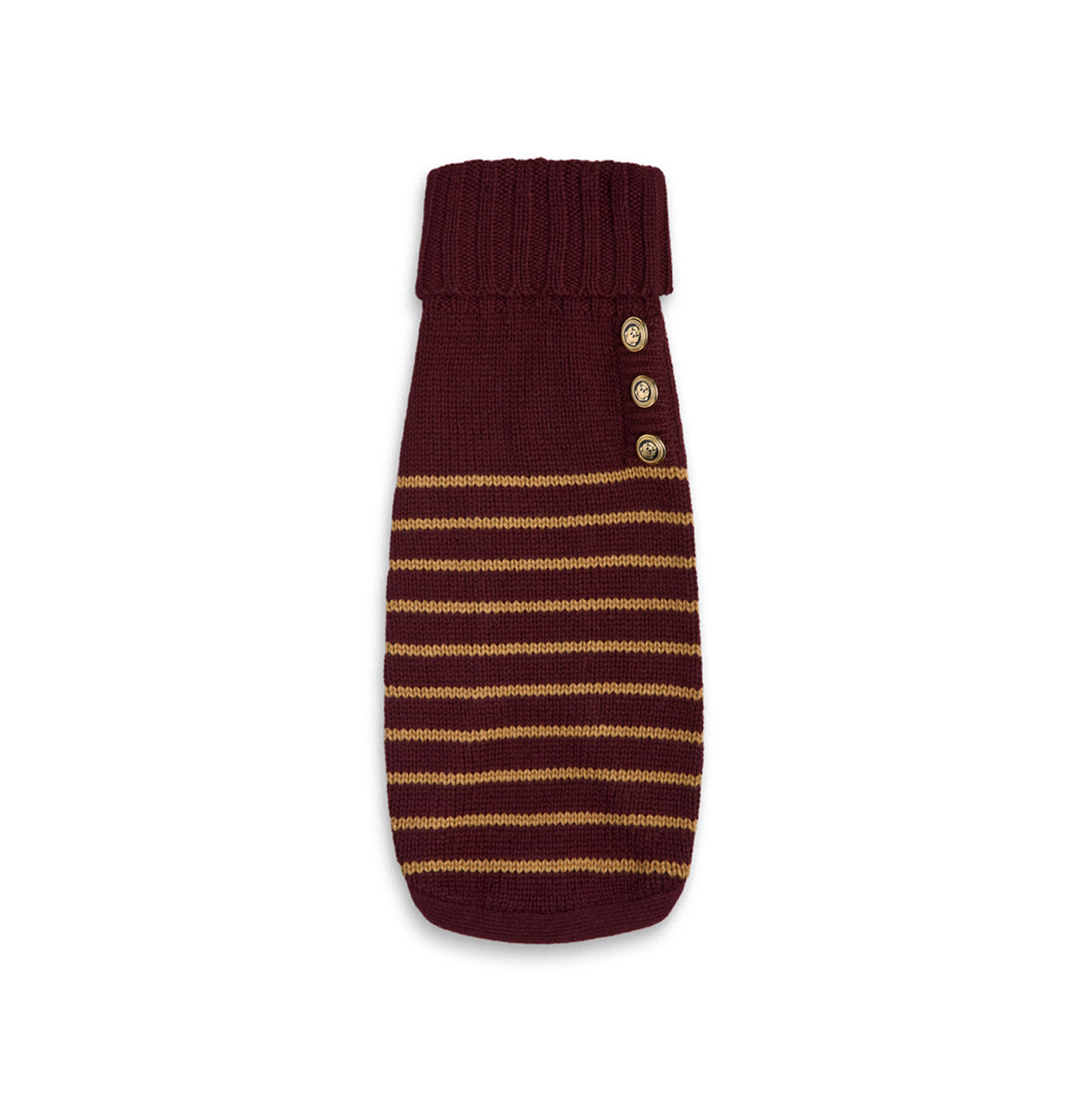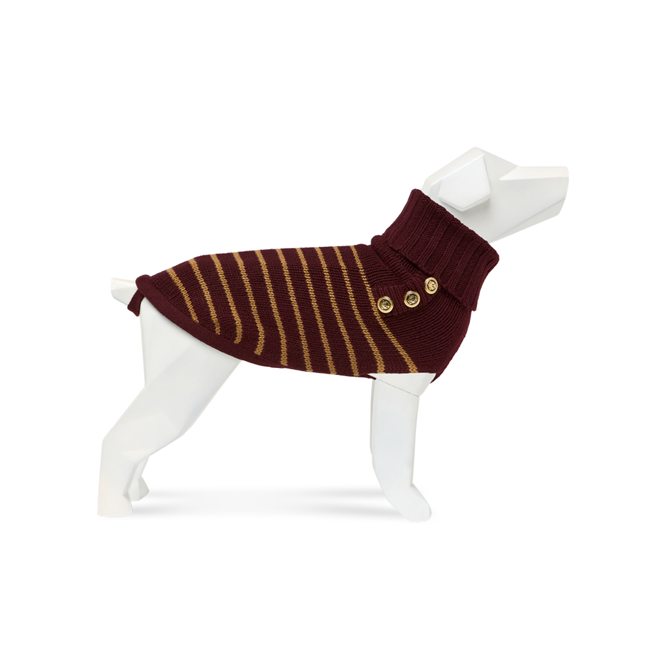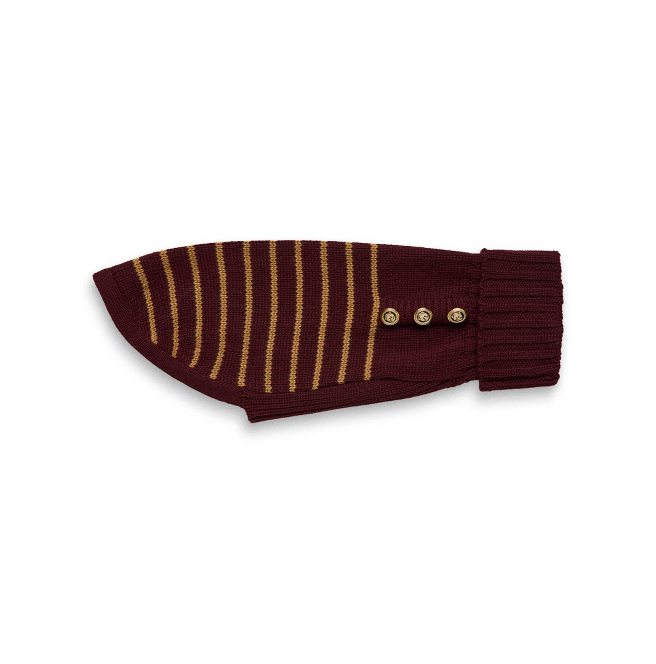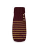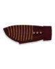 Cappottino Collo alto Bordeaux con righe Cammello. Bottoni smaltati Nero e oro con disegno ancora. Realizzato con filato di pelo Hircus, nobile Cachemire proveniente dalla Mongolia.