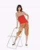 Chiusura ai lati da un bottone ricoperto in pelle marrone o da bottone blu. Composizione: 100% cotone.