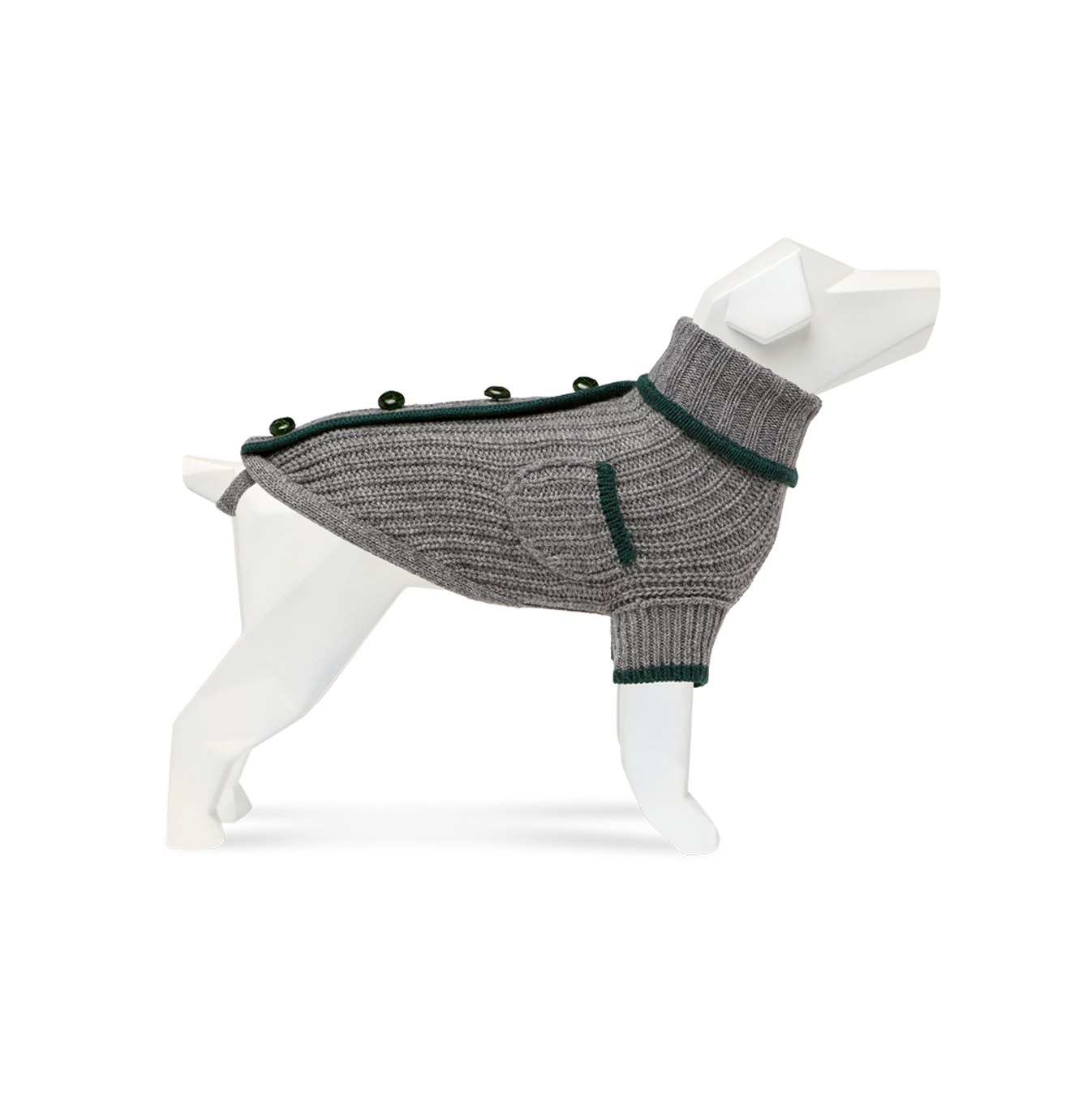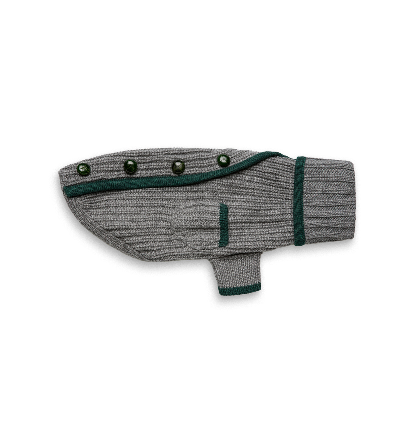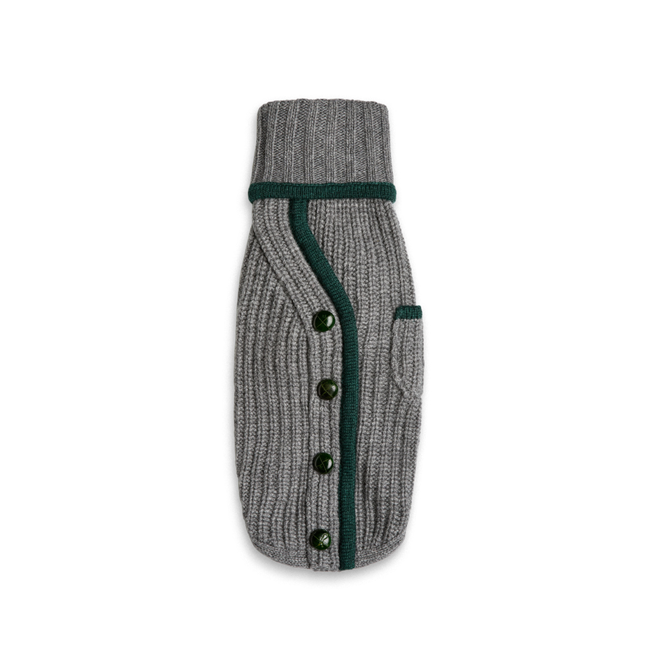 Cappottino Collo alto col. Grigio con taschino e profili Verde. Bottoni in vera pelle Verde. Realizzato con filato di pelo Hircus, nobile Cachemire proveniente dalla Mongolia.