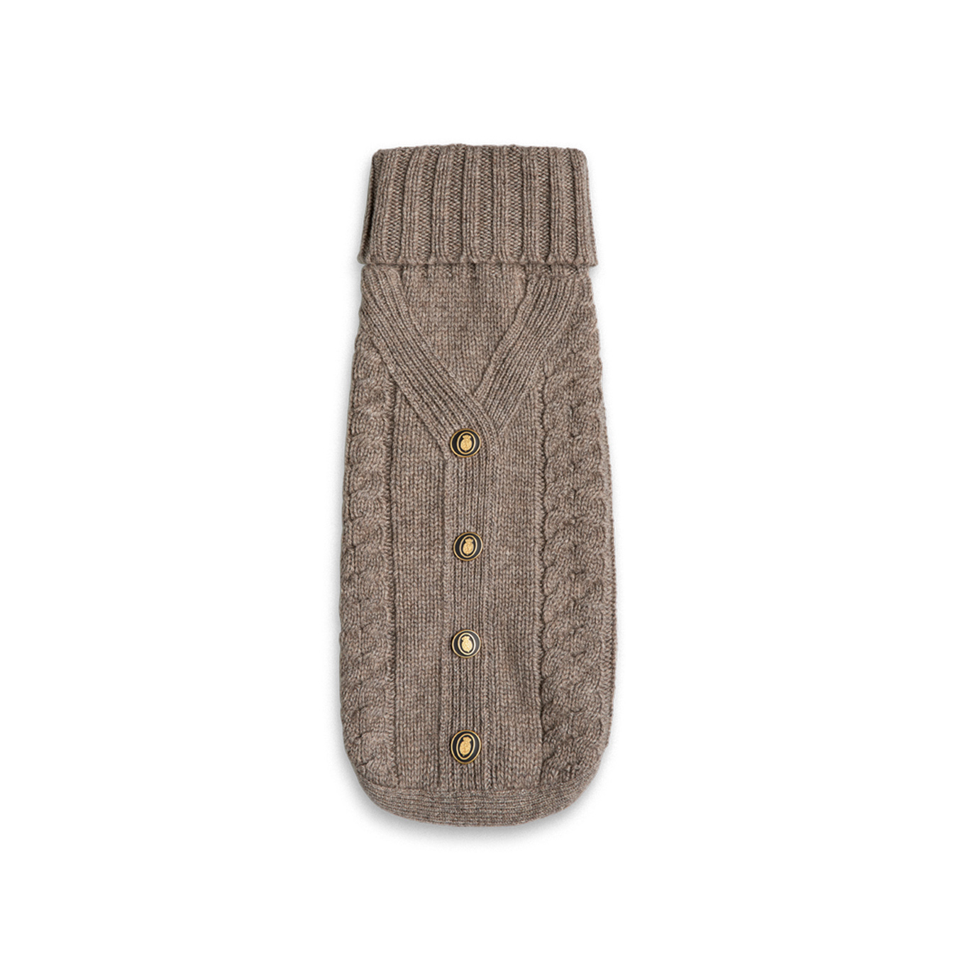 Cappottino Collo alto col. Tortora con lavorazione treccine ai lati. Bottoni smaltati nero con profili e immagine oro. Realizzato con filato di pelo Hircus, nobile Cachemire proveniente dalla Mongolia.