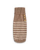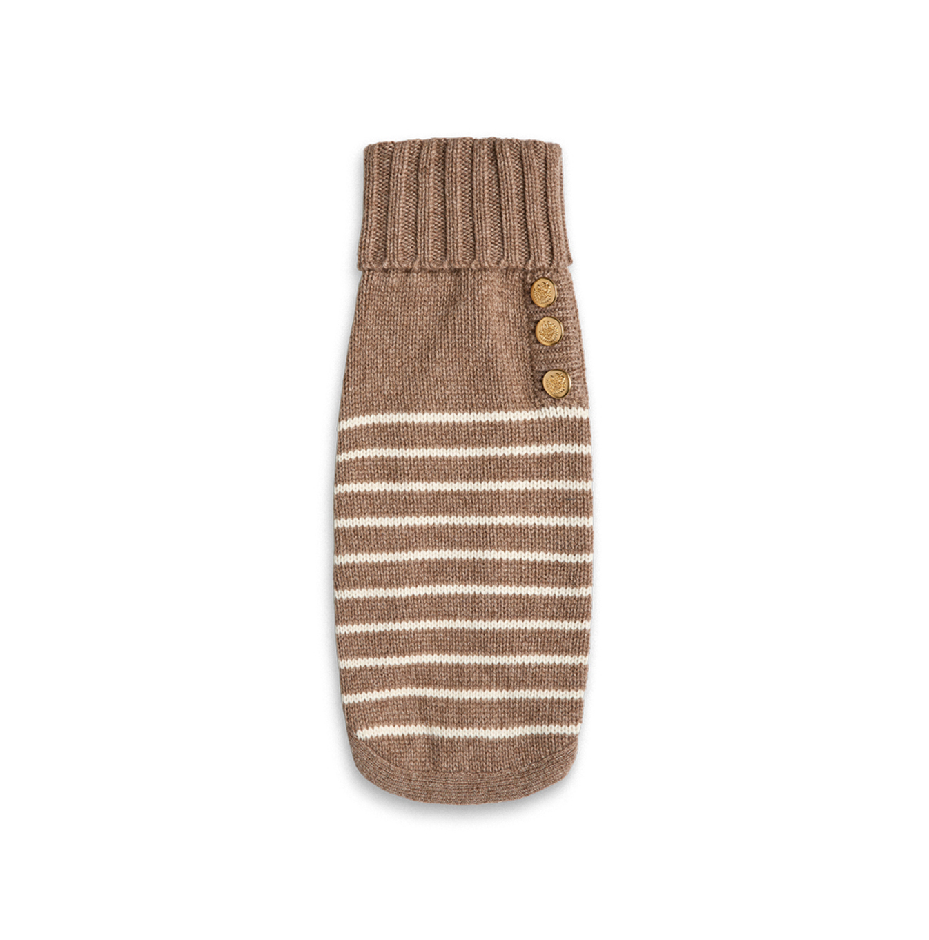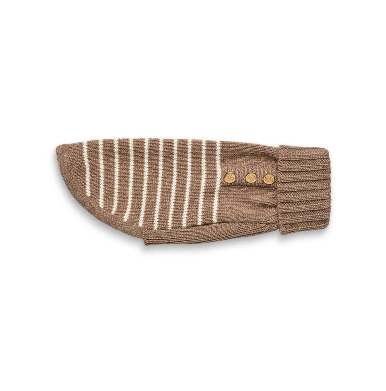 Cappottino Collo alto Brown con righe Natural White. Bottoni smaltati oro con disegno ancora. Realizzato con filato di pelo Hircus, nobile Cachemire proveniente dalla Mongolia.