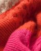 High-necked coat closed in tubular, made of Hircus hair yarn, a noble cashmere from Mongolia, worked in shaved and rib knit.